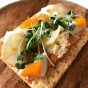 coneri粉を使用したこだわりの薄焼きのパイ生地に、&dipカマンベールバジルをベースに、メインの生ハム、クレソンとマッシュルーム、ラディッシュを彩りよく盛り付けました。りんごの酸味が隠し味のアクセントです。